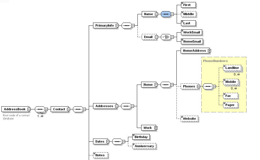 to the XML Schema and the wide variety of elements that might make up any Contact.