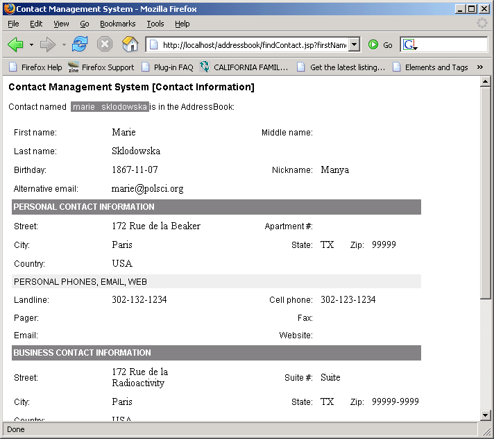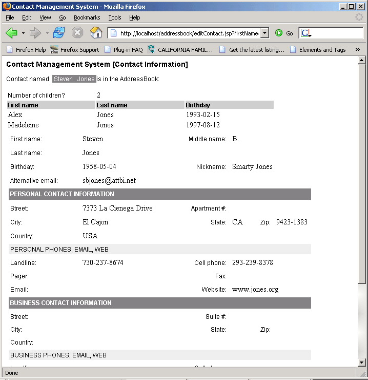 The project was implemented in Java as JavaServer Pages (JSPs) that parsed and managed the file as a DOM structure. The starting menu (ContactManagerHome.jsp) parses the AddressBook.xml and generates a list of names (first name, last name) from the addressbook and displays a link to Edit or Delete the contact, as shown in the following screenshot.
